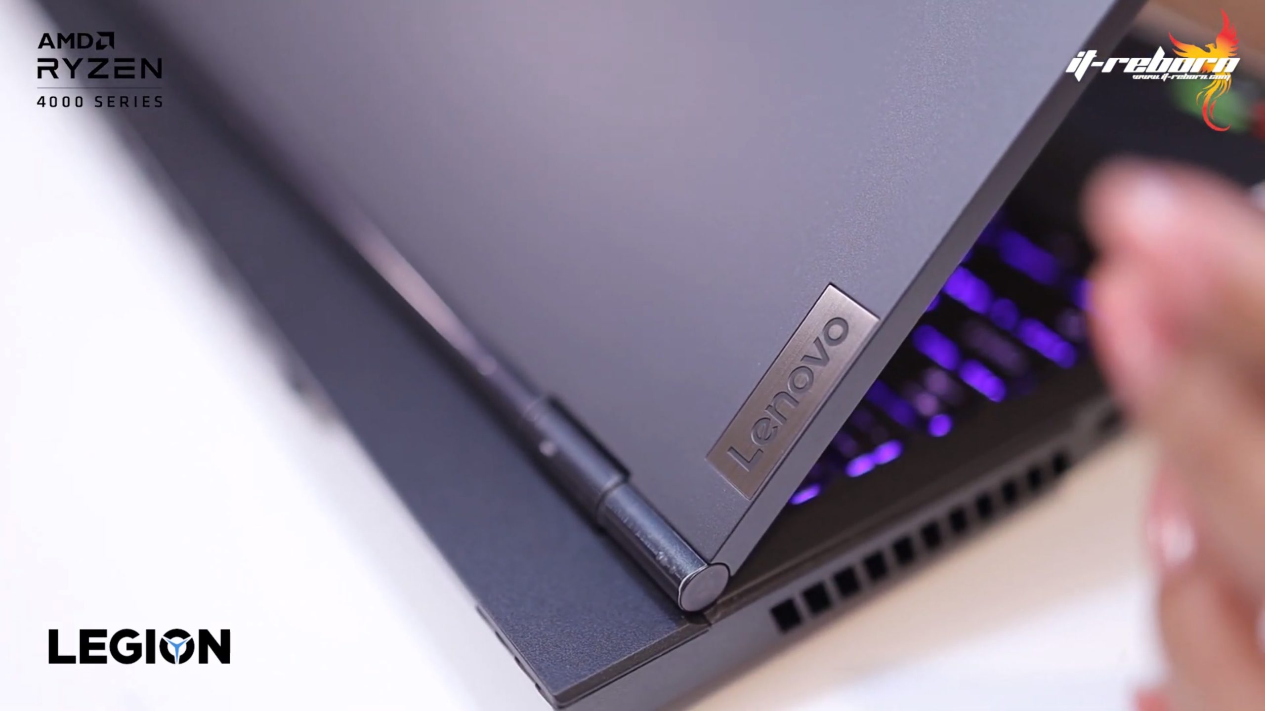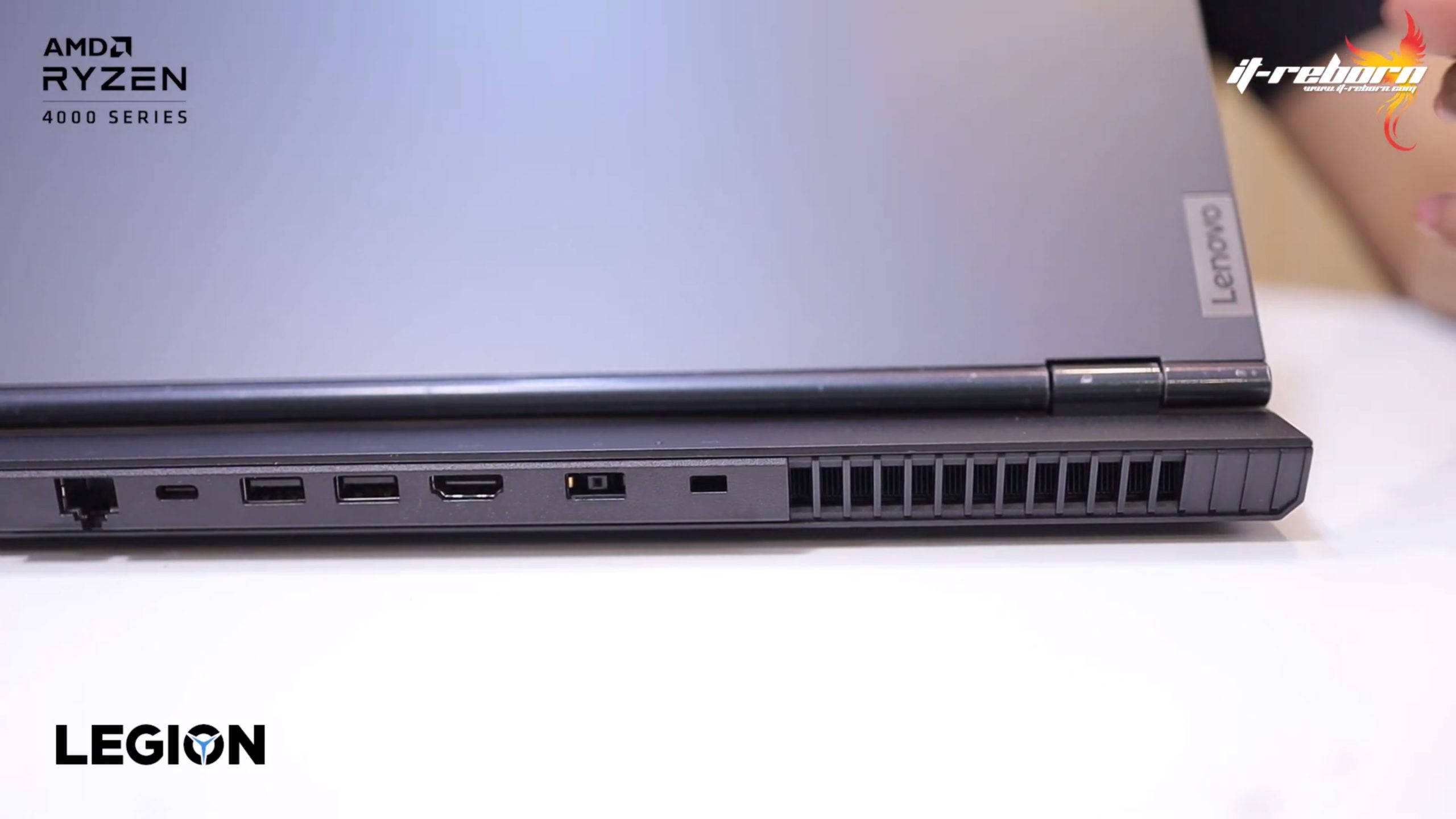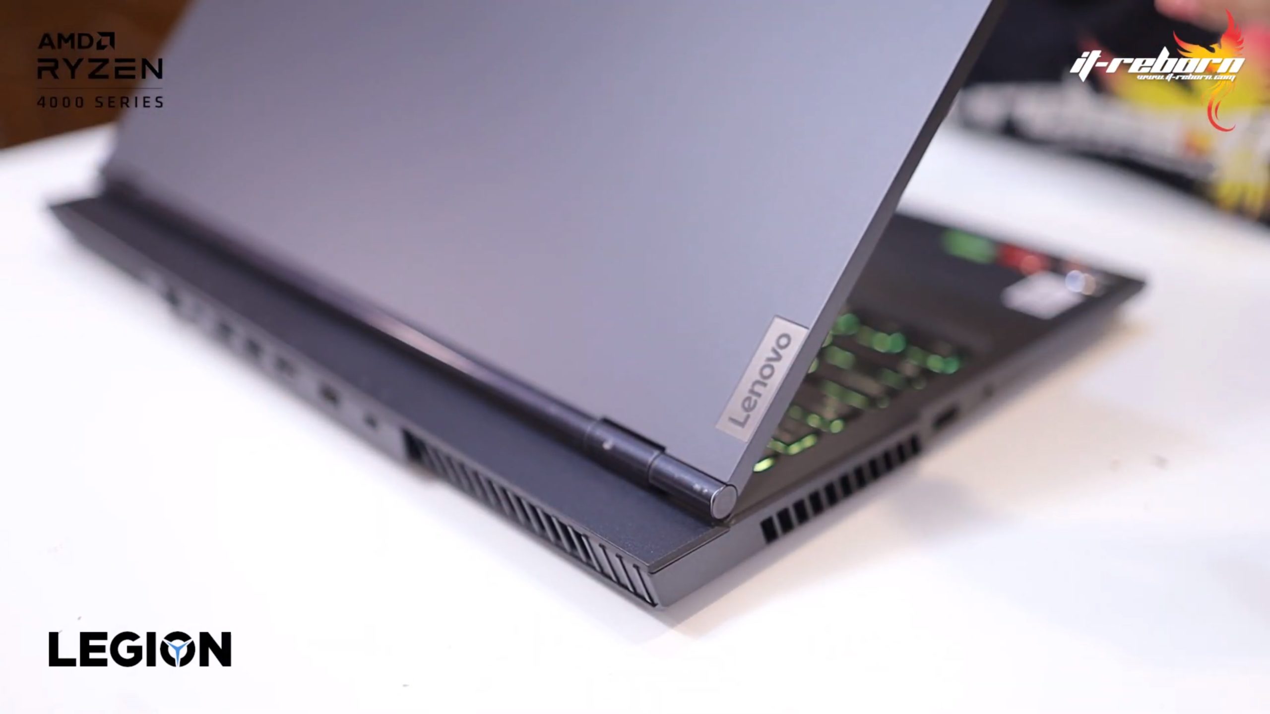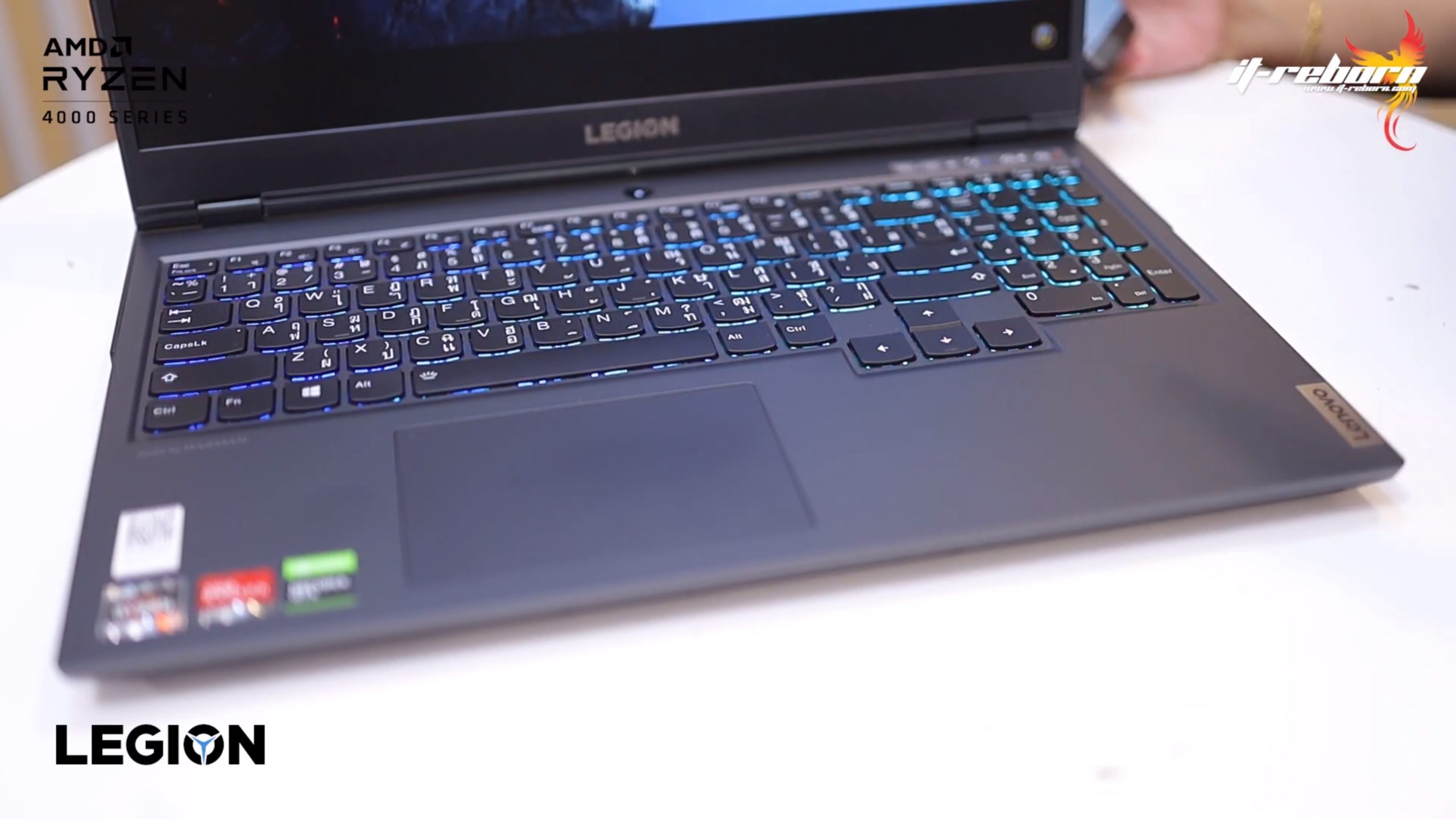 ส่วนโลโก้ แบรนอื่นอาจจะไว้ที่ตรงกลาง แต่สำหรับ LENOVO เลือกที่จะย้ายมาไว้ที่ด้านข้าง เขียนว่า LEGION มาเป็นสีรุ้ง และอีกฝั่งก็จะมีโลโก้ LENOVO ที่ใช้เป็น aluminium page
