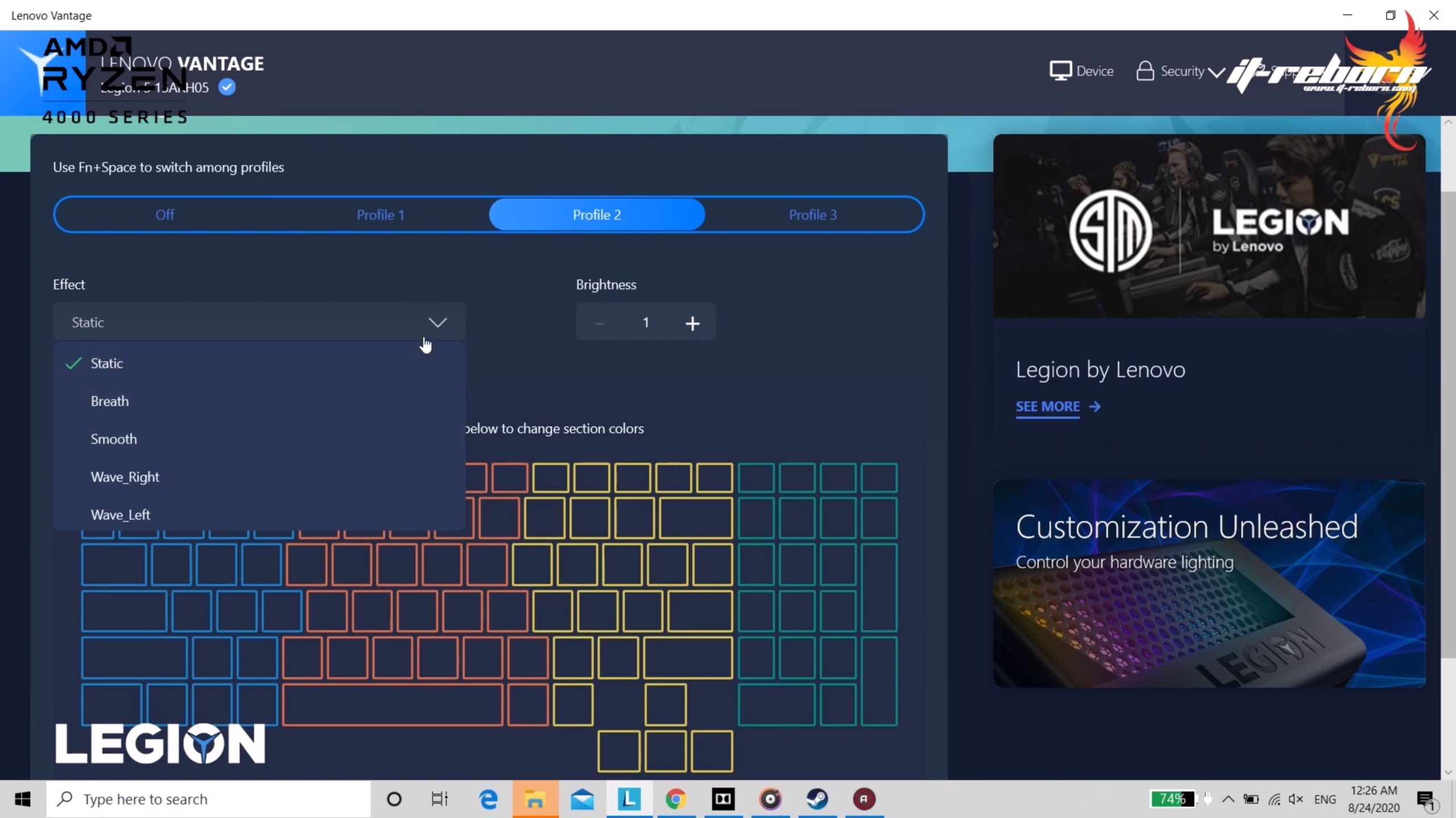 ถัดมาก็จะเป็นการปรับสีไฟของคีย์บอร์ด ที่สามารถปรับได้หลากหลาย มี Profile ให้เลือกได้ถึง 3 Profile หรือว่าจะเขามาในหน้า Customize ตั้งใหม่ได้เลย สามารถปรับตั้งค่าแยกกันได้ถึง 4 โซน และปรับ Effect ต่างๆได้