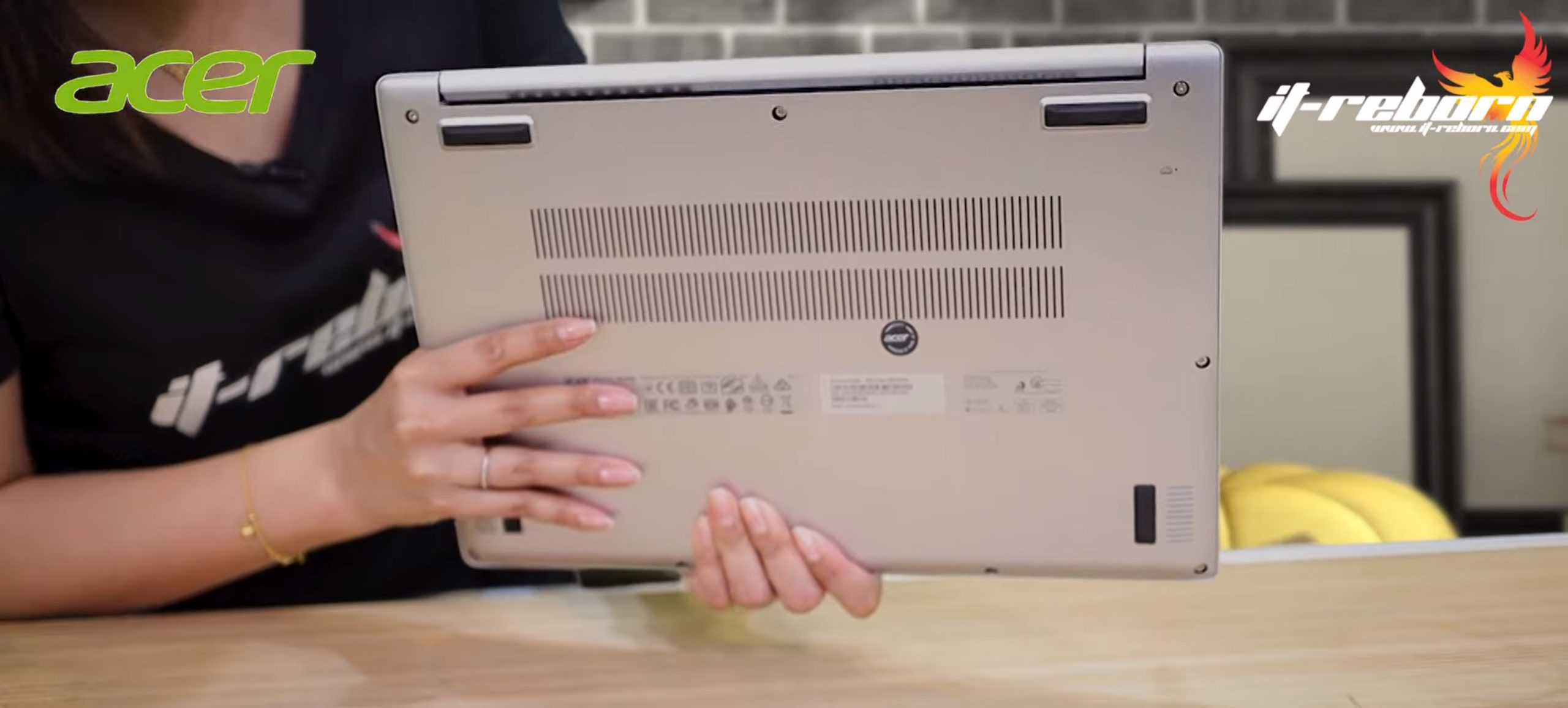 วัสดุที่ใช้ เป็นอลูมิเนียมทั้งตัวเครื่องเลย แม้กระทั้งด้านใต้ตัวเครื่องก็ด้วยเช่นเดียวกันนะคะ พอเรามองเข้ามาก็จะเห็นเป็นช่องระบายความร้อนอยู่ตรงกลางเลย มีแถบยางกันลื่นมาให้นี้ 4 ตำแหน่ง และก็ที่ด้านล่างมาพร้อมกับลำโพงค่ะ