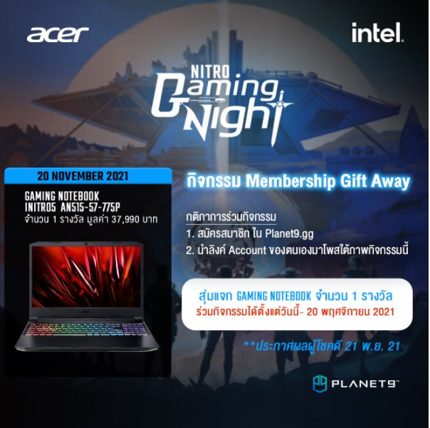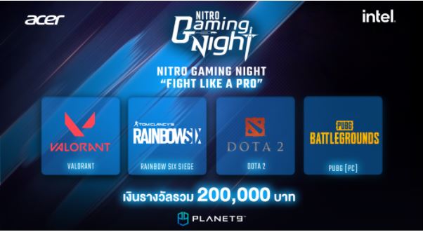 ACER Thailand X INTEL เป็นผู้สนับสนุนหลักในการจัดแข่งกันเกม E-Sports 4 เกมสุดฮิต อย่าง Valorant, Rainbow Six Siege, DOTA 2 และ PUBG [PC] เปิดทัวร์นาเมนต์ในชื่อว่า Nitro Night Gaming แข่งขันออนไลน์รับสมัครผ่านแพลตฟอร์ม Planet9.gg โดยมีเงินรางวัลและของแจกอื่นๆ รวมกันกว่า 100,000 บาท!! เริ่มตั้งแต่เดือนตุลาคม – ธันวาคม ปีนี้ โดยงานนี้รับเฉพาะผู้เข้าแข่งขันทั่วไป ห้ามมืออาชีพมีสังกัดลงแข่งขัน!!